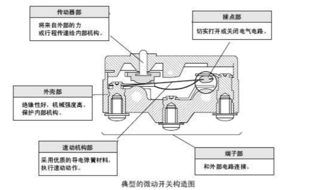 微動開關(guān)由5個(gè)大類的構(gòu)成要素組成。