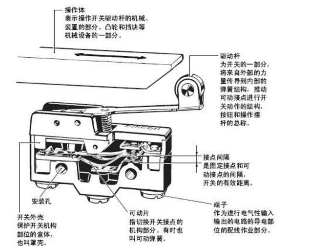 微動開關(guān)具有微小接點(diǎn)間隔和速動機(jī)構(gòu),用規(guī)定的行程和力進(jìn)行開關(guān)動作的接點(diǎn)機(jī)構(gòu),被外殼覆蓋, 其外部有傳動器,且外形較小。下圖為典型的微動開關(guān)構(gòu)造的一個(gè)示例。