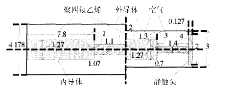 為絕緣介質,如圖2所示(單位:mm)。各段均勻同軸傳輸線之間連接處存在內外導體半徑變化和介質變化,為不連續區,圖中用圓環標記。