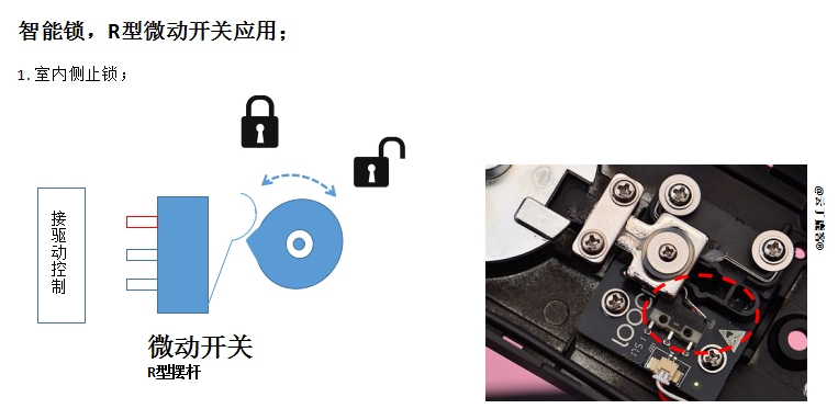 但除了這種常規的直擺桿型微動開關, 還有一種R型擺桿的微動開關也在智能鎖里應用; 見下圖; R型擺桿的微動開關, 用在室內側, 類似于反鎖的機制;事實上不是反鎖, 該功能叫“室內側止鎖”, 用于防止屋內側的寵物或小孩,不經意觸到把手, 而把鎖打開, 而此時大人/主人又不在現場, 繼而產生不安全的存在。