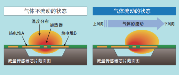 歐姆龍MEMS流量傳感器檢測原理:在沒有氣體流動的情況下以加熱器為中心,溫度分布左右對稱。流動的狀態(tài)下,加熱器上風(fēng)向的溫度低,下風(fēng)向溫度高,溫度分布不再對稱。將該溫差作為熱電堆的電動勢之差進(jìn)行傳感,可測量流量、流速而不影響溫度、壓力。此外,熱電堆為熱電動勢方式,與電阻式相比,有助于降低功耗。