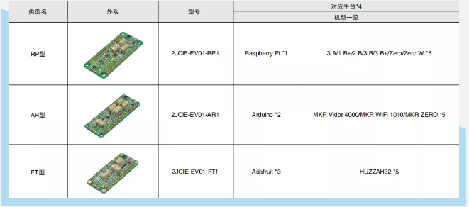 2JCIE-EV評估板共有以下三種型號:2JCIE-EV01-RP1、2JCIE-EV01-AR1、2JCIE-EV01-FT1,分別對應了Raspberry Pi*1、Arduino*2、Adafruit*3三大平臺。