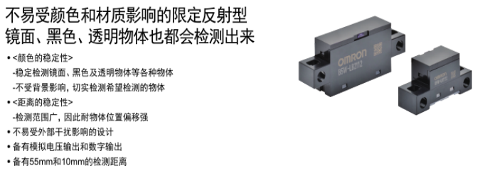 歐姆龍傳感器抗陽光干擾強(qiáng),可穩(wěn)定檢測鏡面、黑色、透明物體,推出限定反射型傳感器B5W系列。接受來自檢測物體的反射光以檢測物體有無,擁有限定了投光光束和受光區(qū)域的光學(xué)系統(tǒng),僅可檢測相距傳感器一定距離(投光光束與受光區(qū)域重合的范圍)的檢測物體。