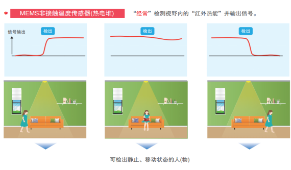 與只能檢測動態物體的熱釋電紅外傳感器,歐姆龍D6T傳感器不僅能檢測動態物體,也能檢測靜止物體,實現即時檢測物體的溫度變化。