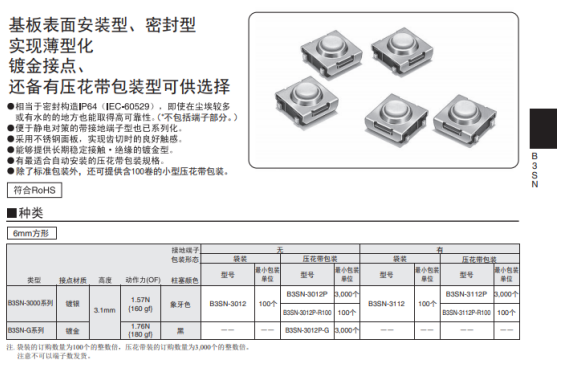 歐姆龍的輕觸開關(guān)普遍應(yīng)用在電動(dòng)牙刷,輕觸開關(guān)適合高密度表面貼裝,有的焊接后可清洗,密封型可防塵,最適合惡劣環(huán)境選用,電路設(shè)計(jì)簡單。產(chǎn)品壽命10萬~1000萬次不等。