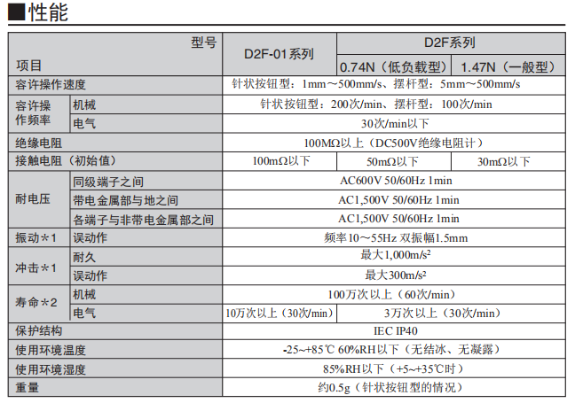 歐姆龍微動(dòng)開關(guān)D2F系列產(chǎn)品性能: