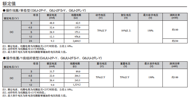 2、G6J信號(hào)繼電器性能參數(shù):