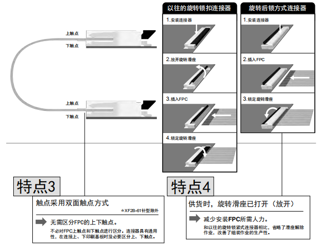 在移動終端、便攜設備等領域高速發展的背景下,產品市場已經越來越趨向于小型化。同時,功能模塊的高度集中和傳輸信號的日益增多,迫切需要端子間距更小、更薄、更輕便的連接解決方案。歐姆龍推出FPC/FFC連接器XF3M,幫助您解決小型化需求。采用旋轉反鎖方式,輕松操作,減少工時。而且產品種類豐富,為您提供更多選擇。