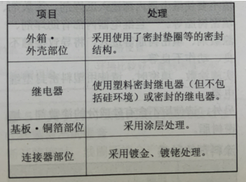 請不要在周圍存在硅氣體(如:二氧化硫、硫化氫)、有機氣體的環境中使用,如果在硫化氣體或有機氣體環境中長時間放置或使用繼電器,接點表面有時會腐蝕,發生接觸不穩定及接觸障礙,端子的焊接性下降,如果在硅氣體環境中長時間放置或使用繼電器,接點表面會生成硅膜,導致接觸不良,如果進行下表內的處理,惡性氣體的影響會降低: