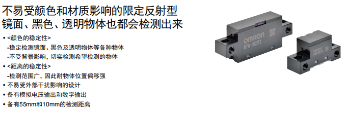 對于玻璃機械來說,歐姆龍檢測有無的光電傳感器B5W-LB2112-1擁有著絕對優勢。歐姆龍傳感器抗陽光干擾強,可穩定檢測鏡面、黑色、透明物體,接受來自檢測物體的反射光以檢測物體有無,擁有限定了投光光束和受光區域的光學系統,僅可檢測相距傳感器一定距離(投光光束與受光區域重合的范圍)的檢測物體。