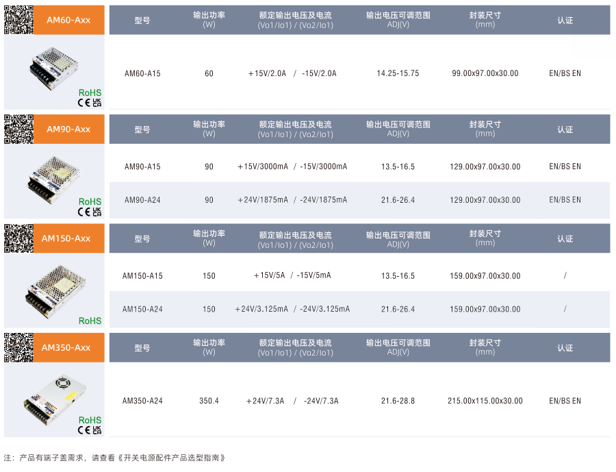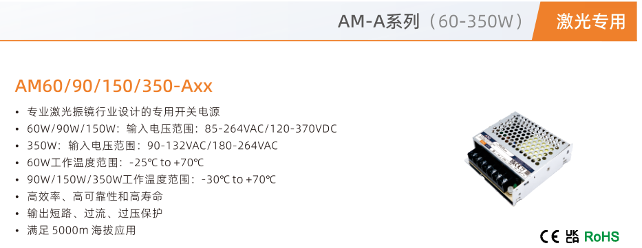 AM60/90/150/350-Axx, ·專業激光振鏡行業設計的專用開關電源 ·60W/90W/150W:輸入電壓范圍:85-264VAC/120-370VDC ·350W:輸入電壓范圍:90-132VAC/180-264VAC ·60W工作溫度范圍:-25°Cto+70C ·90W/150W/350W工作溫度范圍:-30℃to+70℃℃ ·高效率、高可靠性和高壽命 ·輸出短路、過流、過壓保護 ·滿足 5000m 海拔應用
