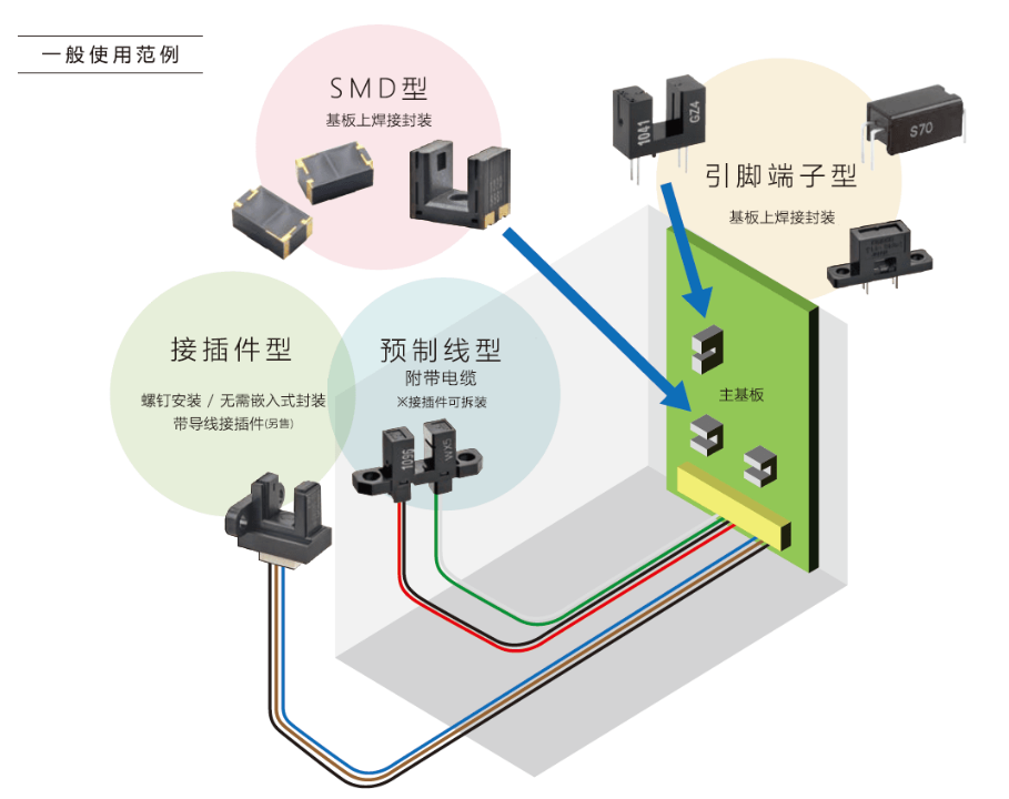 · 請根據設備選擇電路板封裝、嵌入、螺釘安裝等的安裝方法。此外,還備有表面封裝、通孔封裝、預制線連接、連接器連接等各種連接方式。
