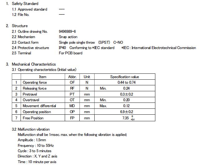 D2FC-F-7N(10M), 克力為:60+/-15G,壽命為1000萬次;