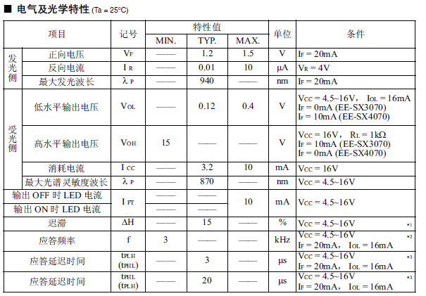 光電IC輸出型微型光電傳感器[透過型] 受光元件與增幅回路內(nèi)置于一個(gè)芯片 受光元件中內(nèi)置有溫度補(bǔ)償回路 適用電源電壓為DC4.5 ~ 16V 可直接連接C-MOS、TTL 高分辨率(狹片寬度 0.5mm) 遮光時(shí)ON型:EE-SX3070