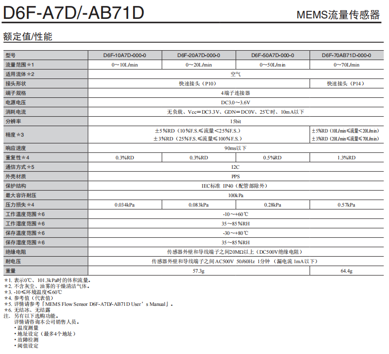D6F-A7D/-AB71D 氣體流量歐姆龍傳感器
